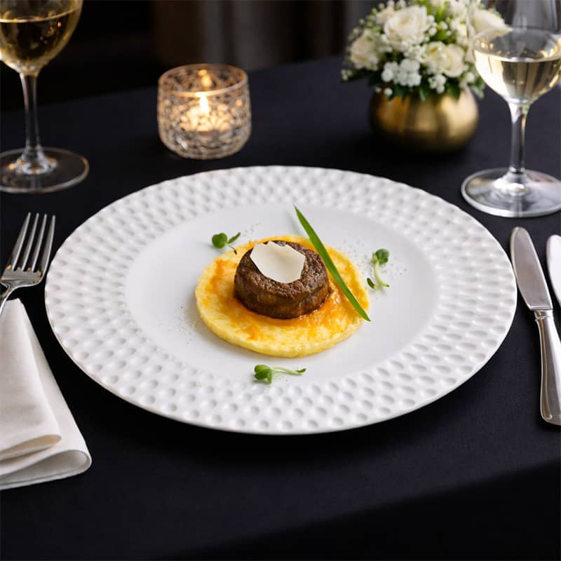 Assiette Nova affirme une présence contemporaine par son rebord subtilement texturé, signature graphique qui encadre la création culinaire avec précision.