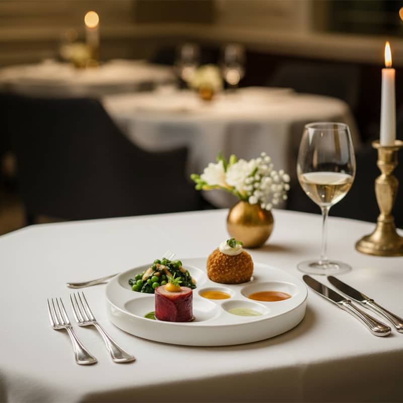 Réalisée en pierre d’acrylique blanche ou marbrée, elle se distingue par sa réserve sur mesure, permettant d’accueillir avec précision sauces, garnitures ou compositions spécifiques.