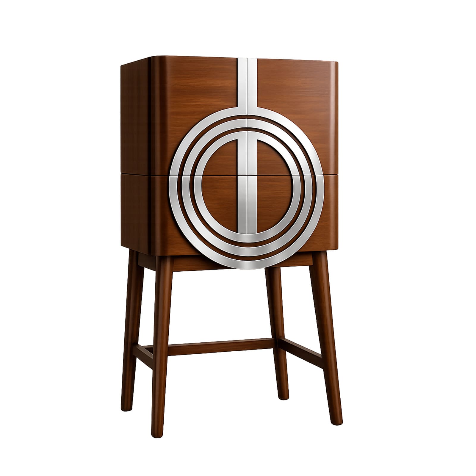 Réalisée en bois et métal, elle associe chaleur naturelle et précision architecturale. Sa structure intègre des compartiments dédiés pour bouteilles et verres, permettant une organisation claire et sophistiquée du service.