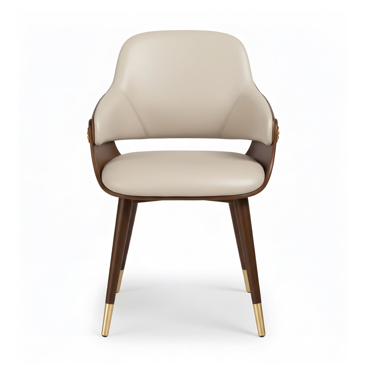Sa coque enveloppante bicolore en cuir et bois crée un dialogue subtil entre chaleur naturelle et sophistication tactile. Les médaillons latéraux en laiton apportent une signature précieuse et architecturale, tandis que les pieds effilés terminés par des sabots en laiton soulignent la finesse de sa silhouette.