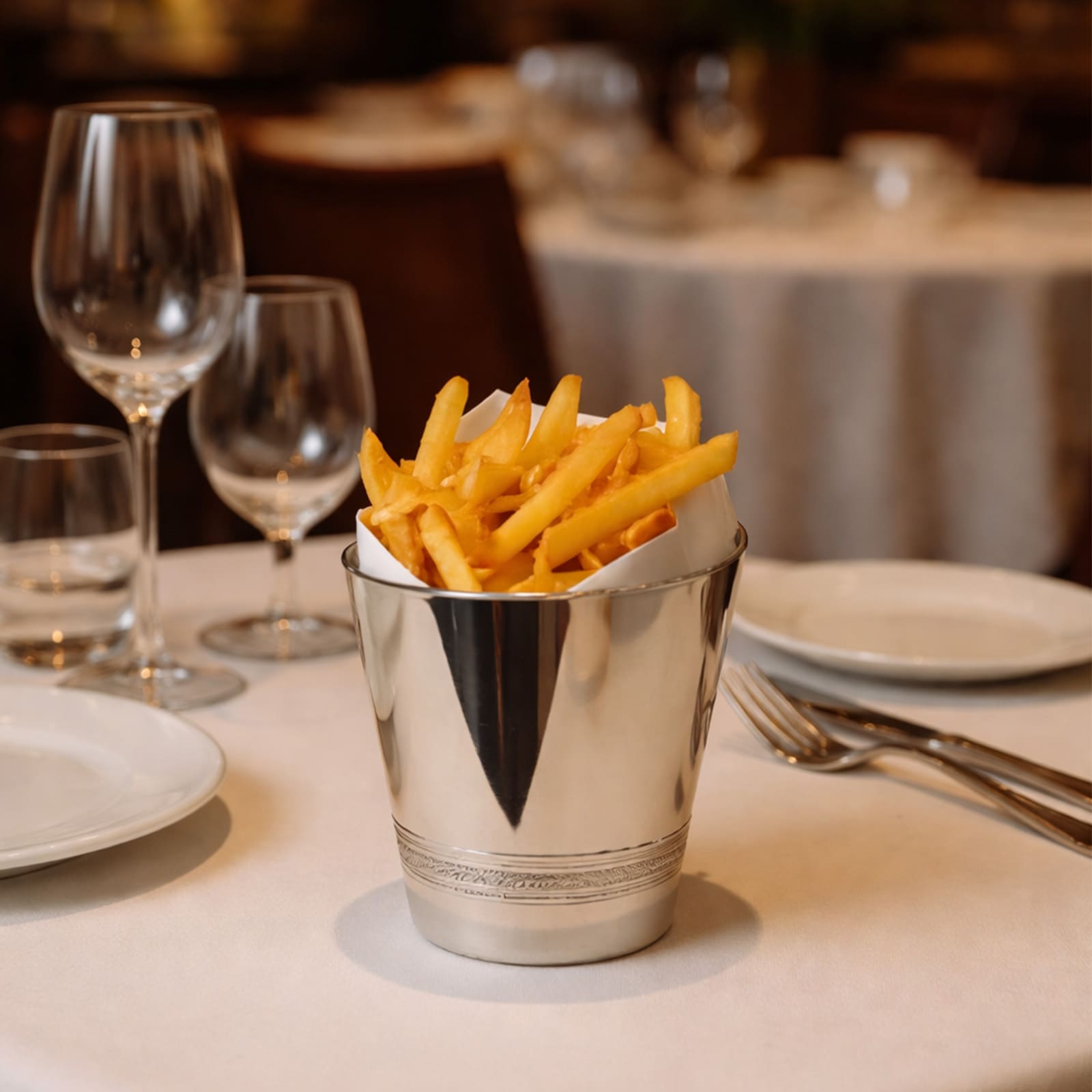 Réalisé en métal argenté, il se distingue par sa silhouette légèrement asymétrique, apportant mouvement et caractère à la table. Ses moulures et filets personnalisables permettent d’adapter chaque pièce à l’identité esthétique de votre établissement.