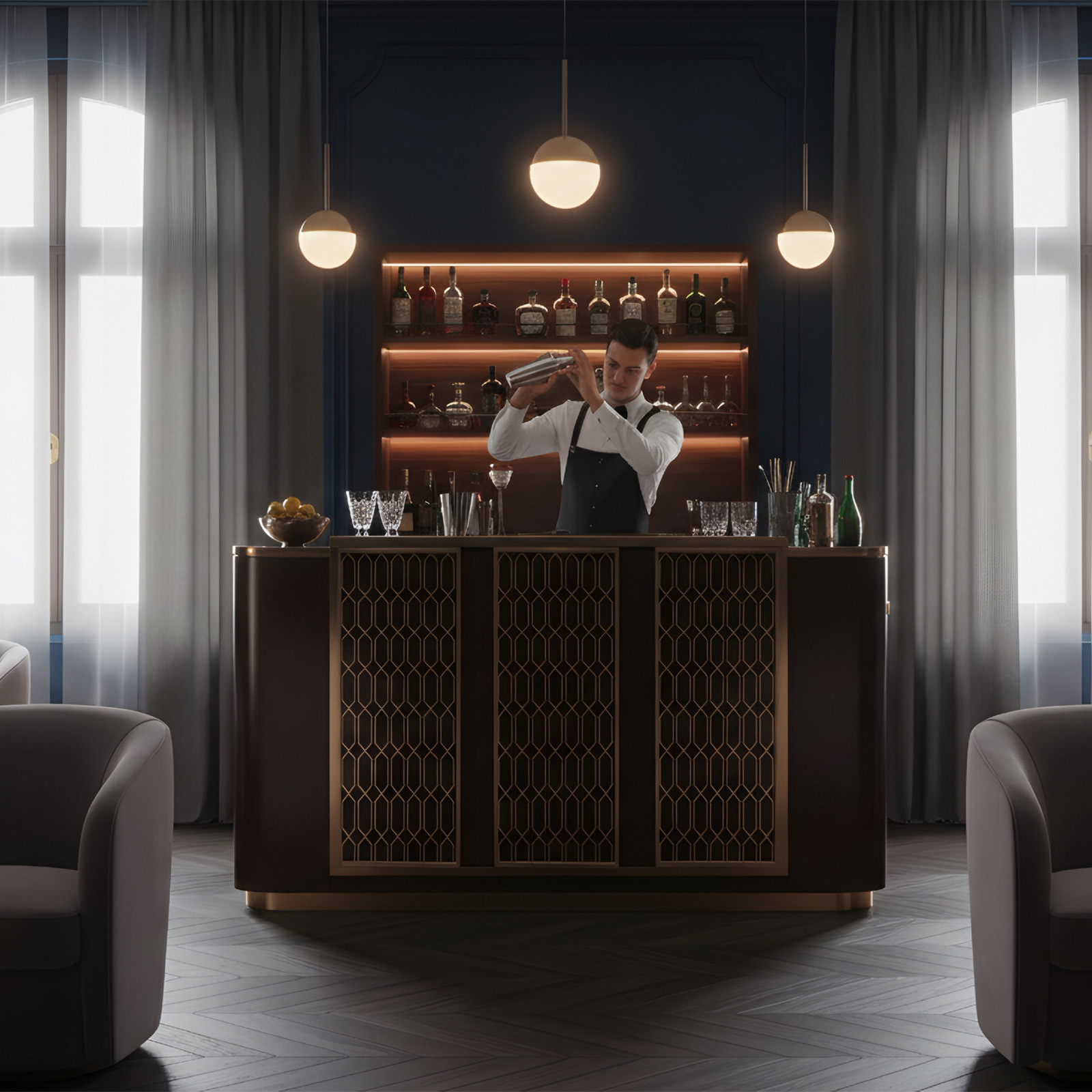 Le Meuble Bar incarne l’équilibre entre élégance intemporelle et fonctionnalité professionnelle.