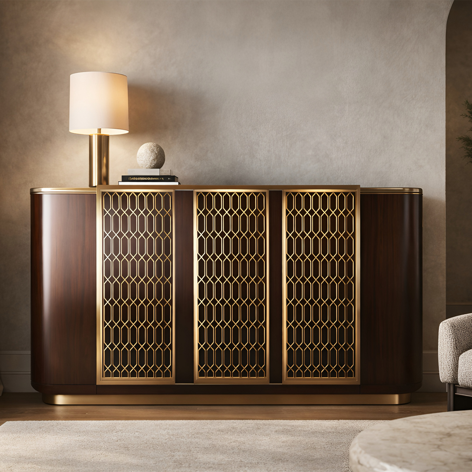 Réalisé en bois chaud, sublimé par des liserés en laiton, il se distingue par ses lignes épurées et ses angles adoucis, apportant une présence sophistiquée et accueillante. Son esthétique sobre lui permet de s’intégrer harmonieusement dans des univers contemporains comme classiques.