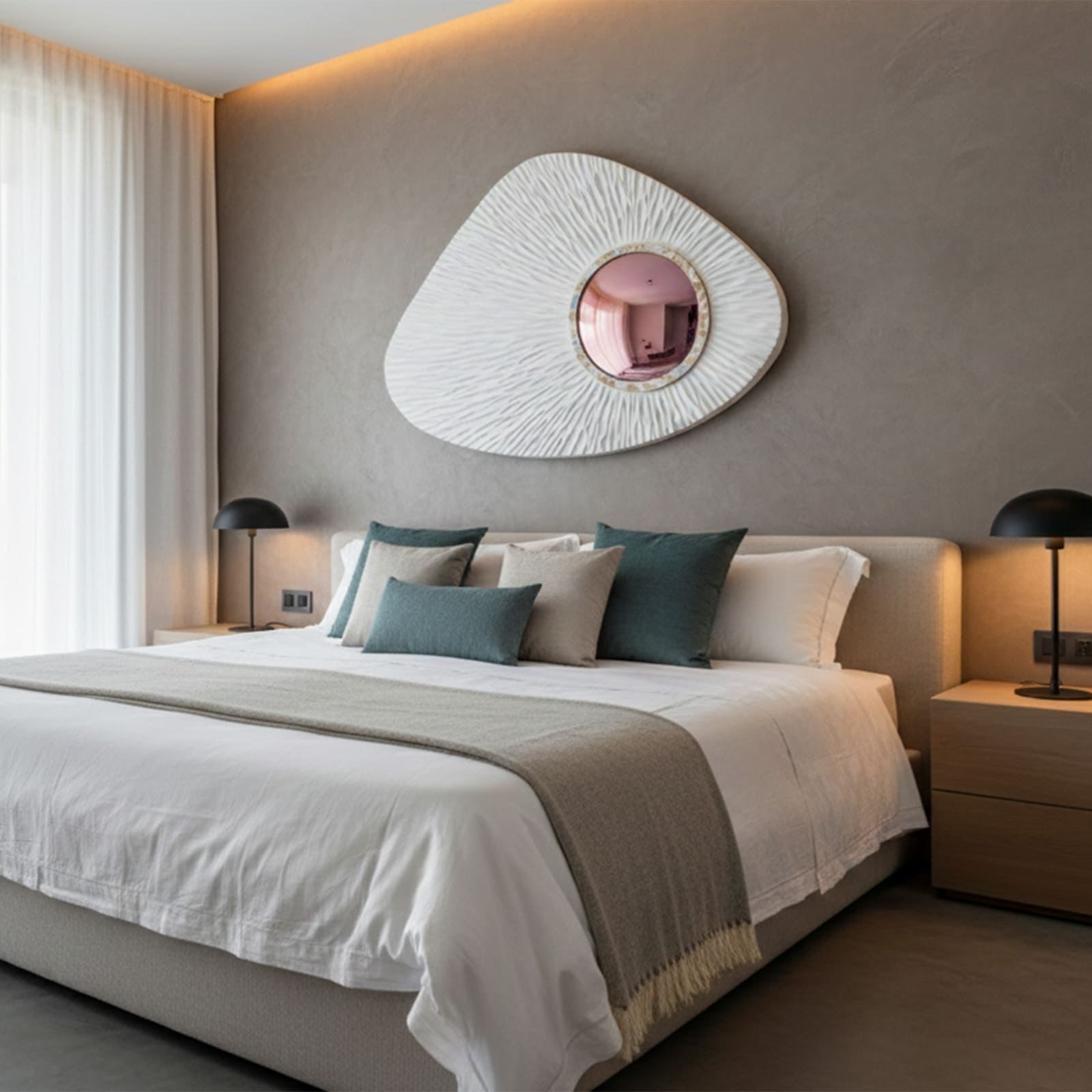 Son miroir de sorcière coloré, légèrement bombé, amplifie la perspective et confère une présence presque mystique à l’espace. Cette surface réfléchissante crée un effet immersif unique, idéal pour structurer un mur avec caractère.