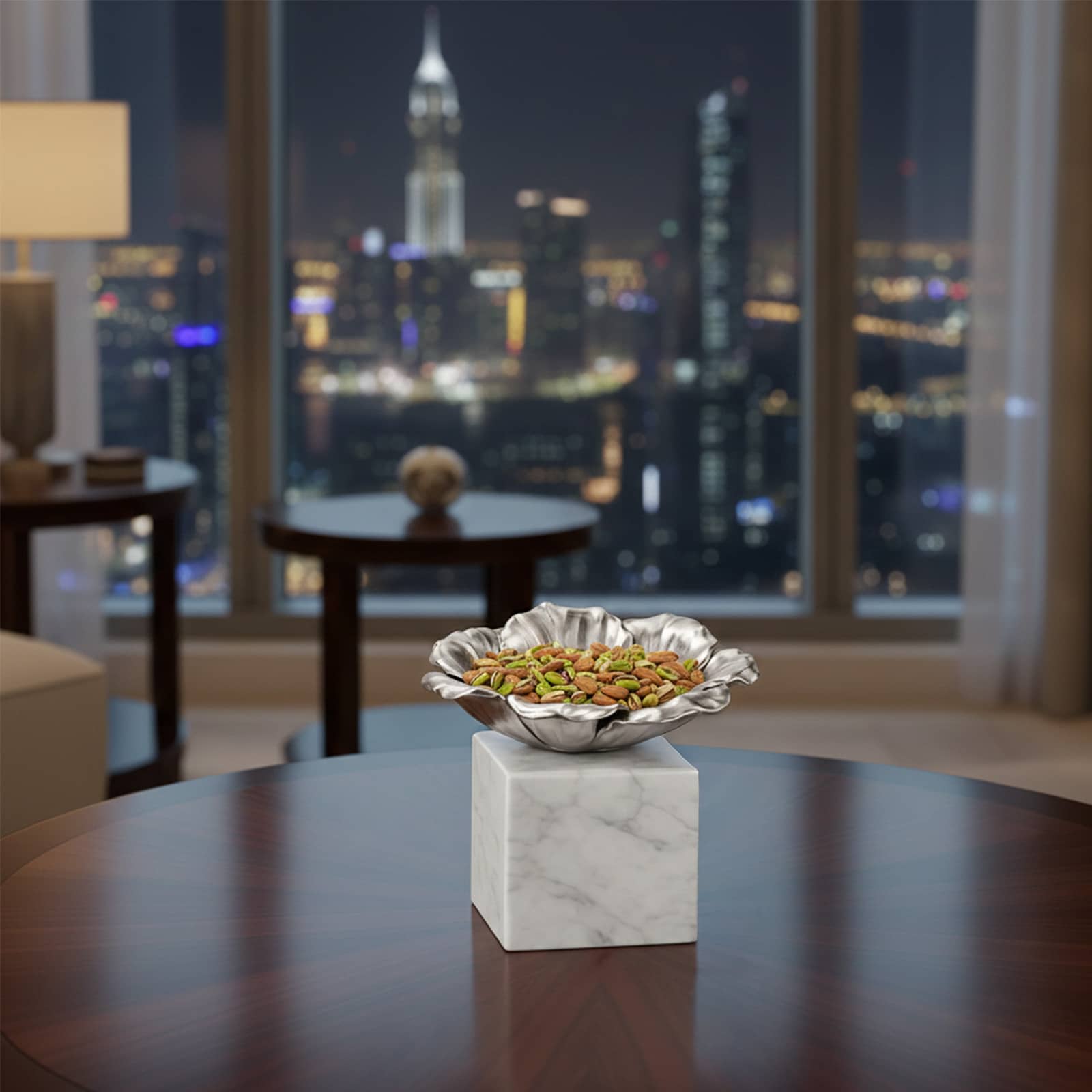 Sa forme travaillée crée un jeu d’ombres et de reflets qui magnifie les textures et les couleurs des fruits secs ou douceurs présentées.