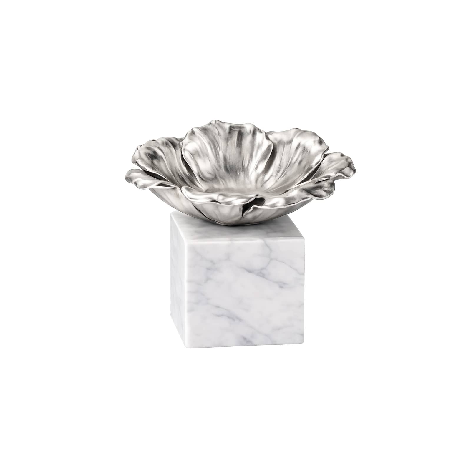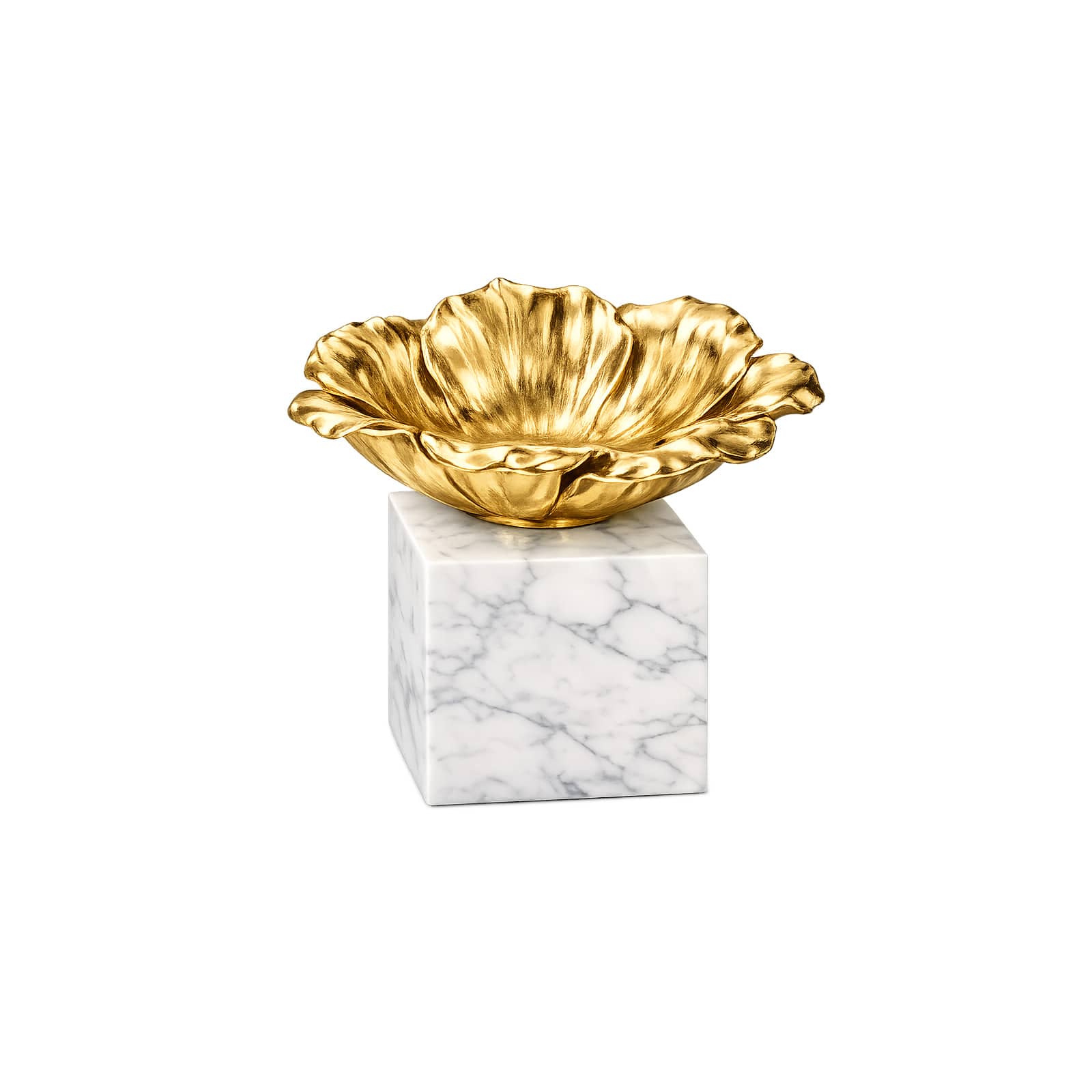Inspiré de la forme délicate d’une rose, son récipient révèle une silhouette organique aux reliefs subtils. Réalisé en métal argenté poli ou en laiton doré, il capte la lumière avec élégance et structure la mise en scène avec sophistication.