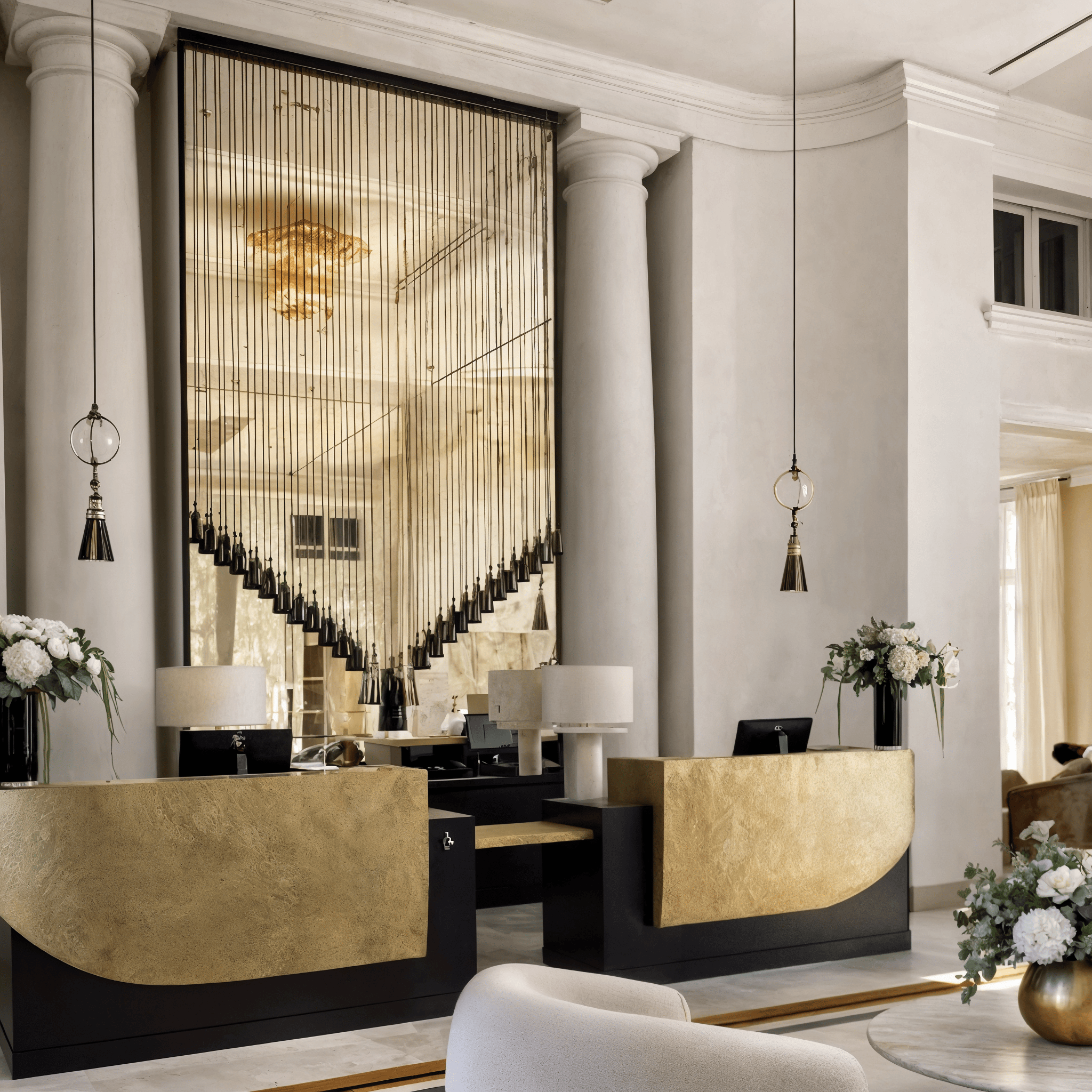 Ce décor en passementerie dessine un rideau architectural, structurant l’espace avec théâtralité et élégance. Les volumes textiles créent une profondeur spectaculaire, amplifiée par un miroir antique qui prolonge la composition dans une perspective infinie.