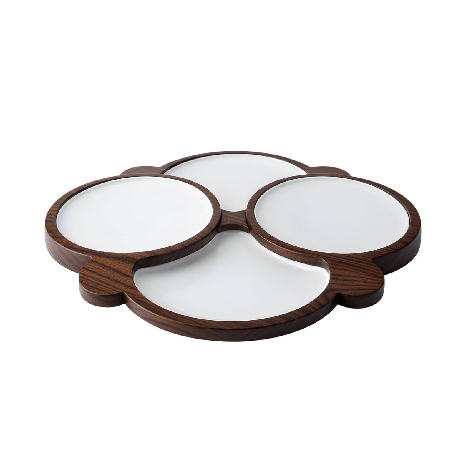 Son support en bois accueille quatre réceptacles amovibles en pierre d’acrylique blanche ou marbrée, créant une composition structurée et lumineuse. L’association du bois chaleureux et de la pierre aux tonalités claires apporte contraste, profondeur et raffinement à la présentation.