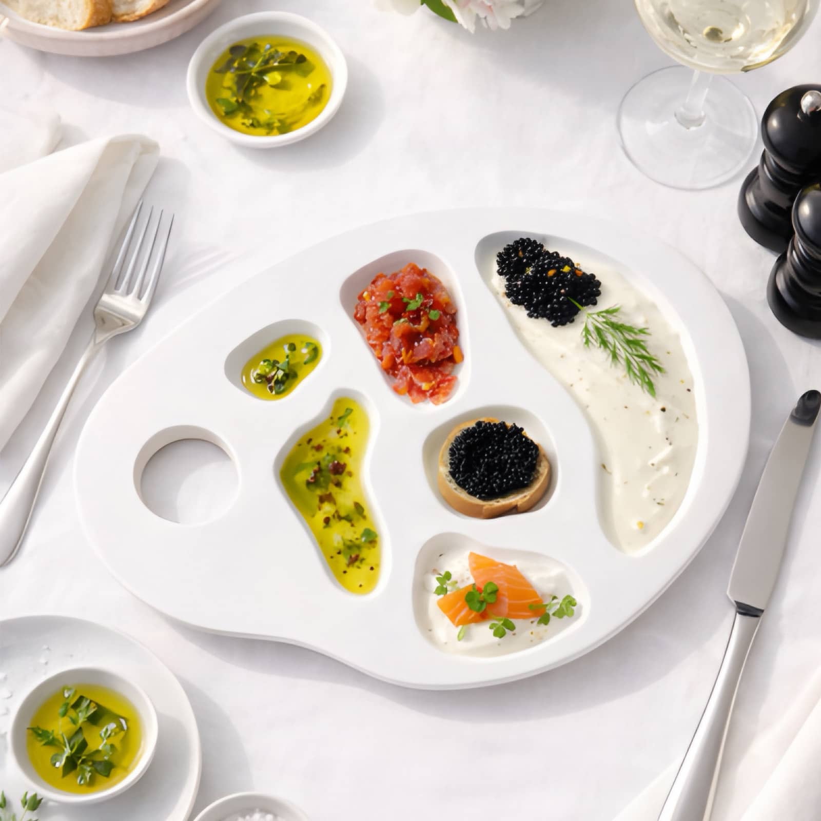 Ce Présentoir intègre six empreintes dédiées, permettant d’accueillir le caviar ainsi que ses condiments avec précision et élégance. Chaque cavité est pensée pour structurer la présentation et offrir une lecture claire et raffinée du dressage.