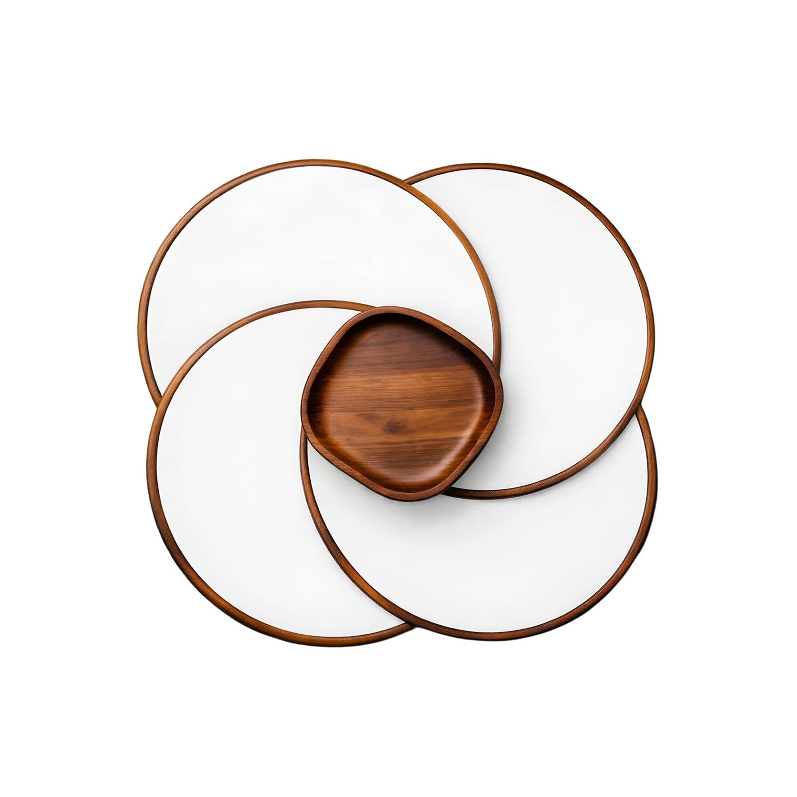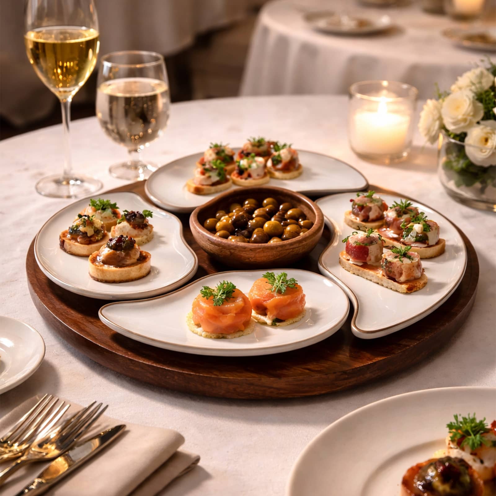 Son support en bois accueille quatre réceptacles amovibles en pierre d’acrylique blanche ou marbrée, créant une composition équilibrée et naturellement élégante. L’association des matières apporte profondeur et contraste, idéale pour sublimer une présentation gastronomique avec sobriété.