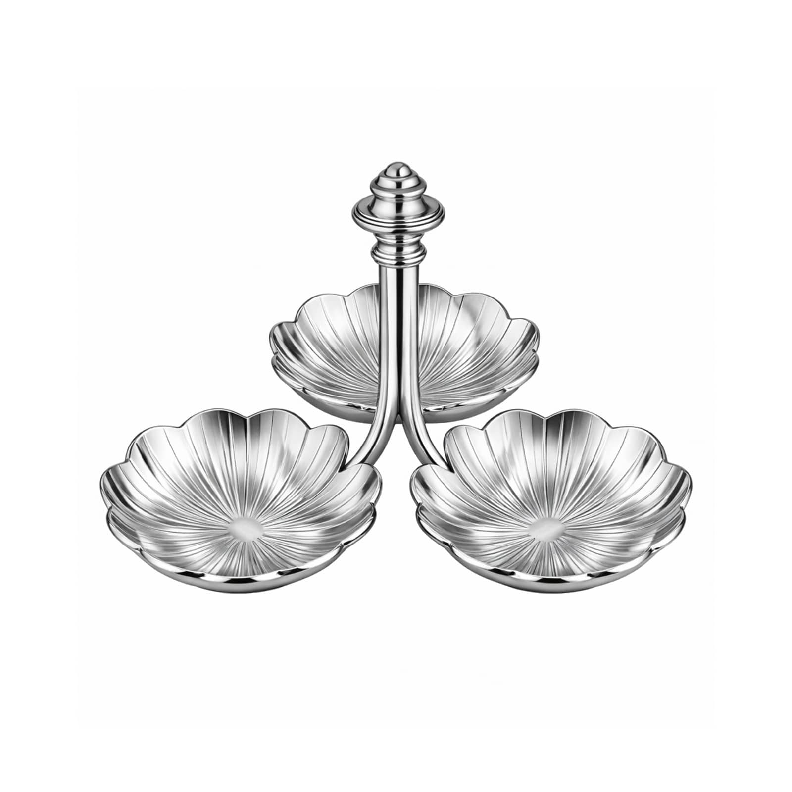 Composé de trois réceptacles en métal argenté ou laiton, délicatement ciselés à la main, il révèle un travail de texture subtil qui capte la lumière et enrichit la présentation. Chaque détail témoigne d’un savoir-faire artisanal maîtrisé, transformant un élément de service en objet décoratif.