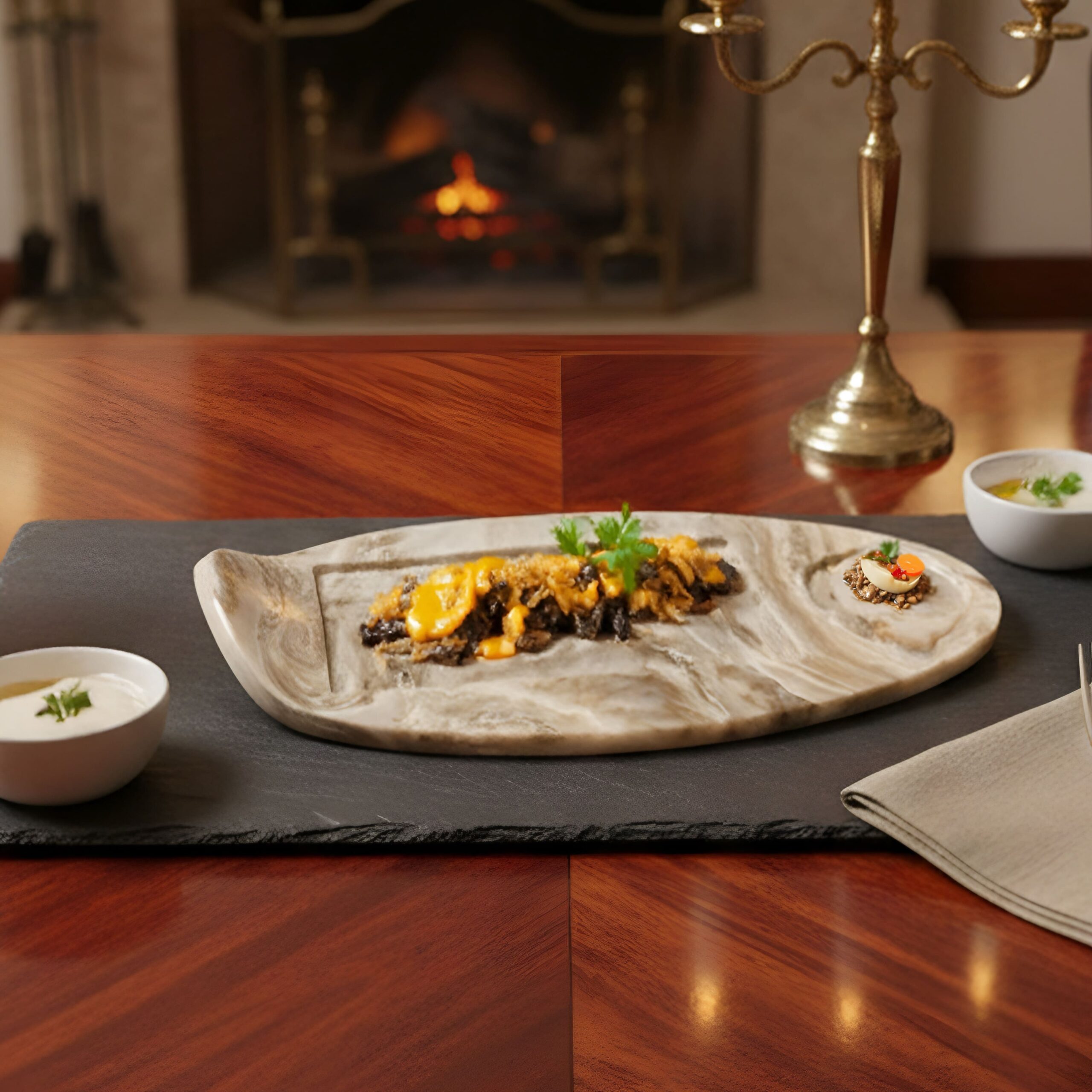 Pensé comme un socle de mise en scène, ce présentoir offre une surface nette et structurée qui valorise chaque création culinaire avec précision. Sa sobriété en fait une pièce particulièrement versatile, capable de s’intégrer dans des univers contemporains comme plus classiques.