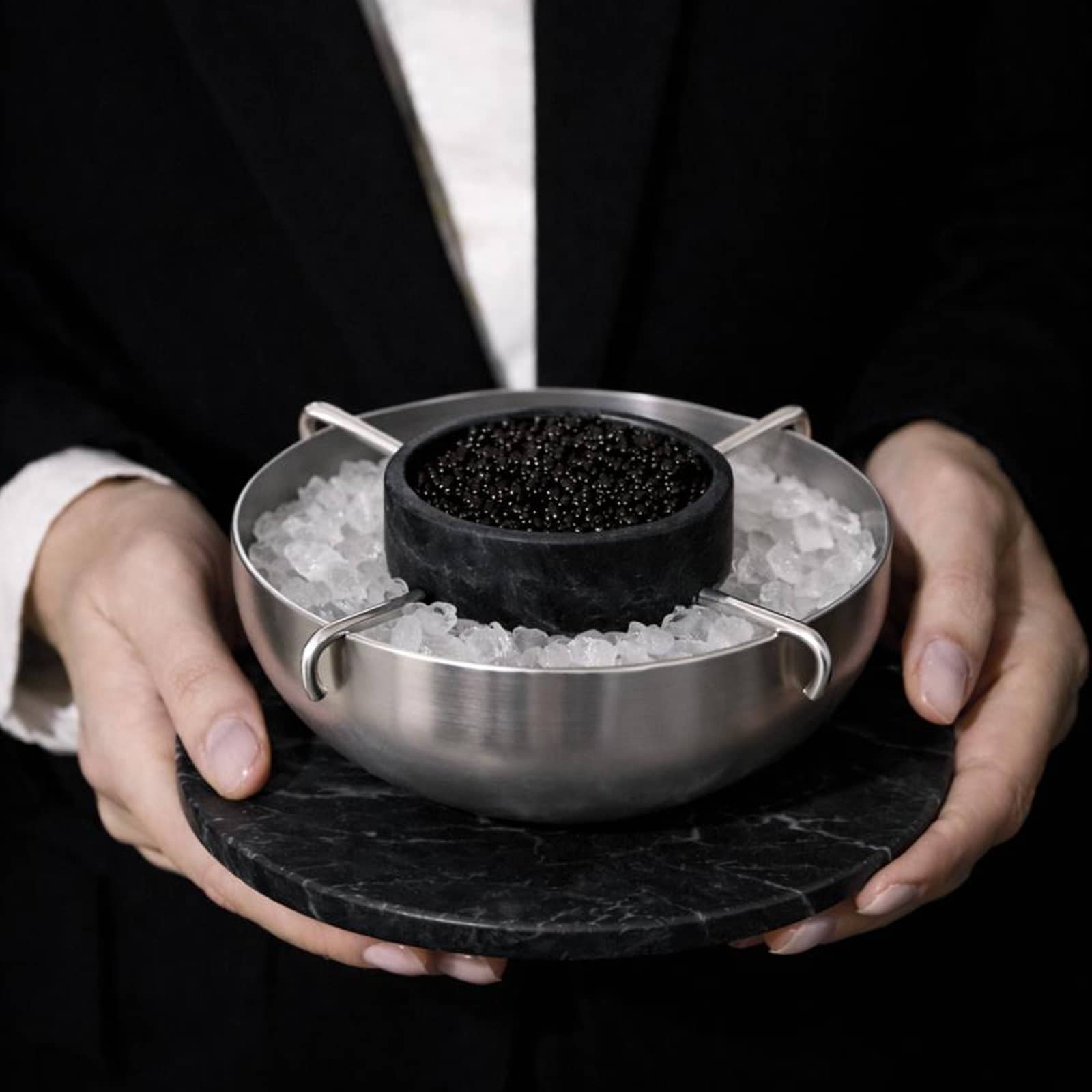Réalisé en pierre d’acrylique blanche ou marbrée, il offre une présence minérale élégante tout en garantissant le maintien optimal de la fraîcheur. Sa matière non poreuse et stable permet d’accueillir le caviar dans des conditions parfaitement adaptées au service gastronomique.