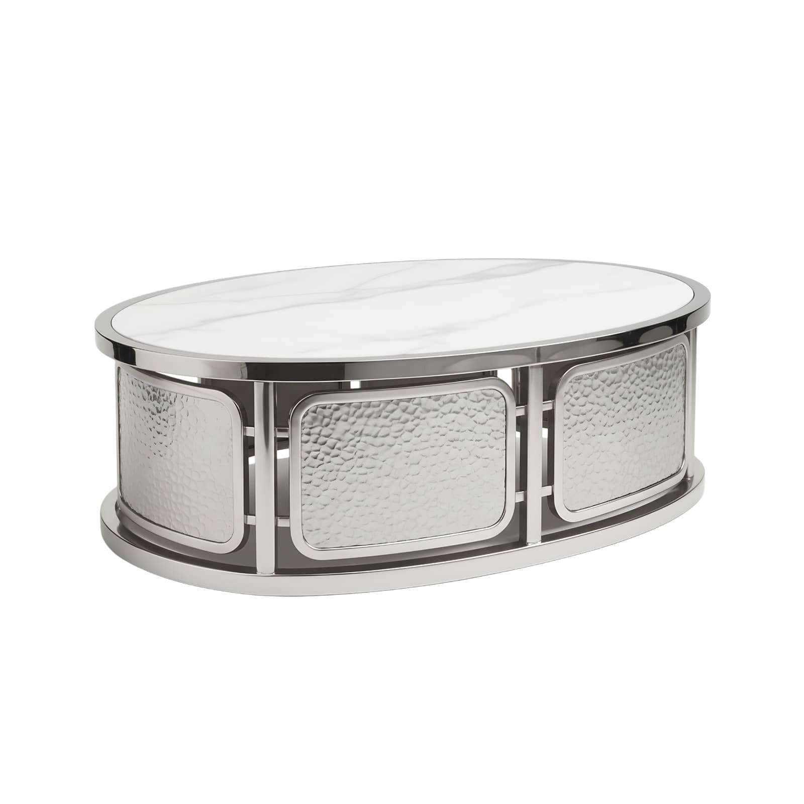 Son support en métal argenté ou en laiton, travaillé avec une finition martelée, révèle un jeu subtil de texture et de lumière. Cette surface artisanale apporte caractère et profondeur à la présentation.