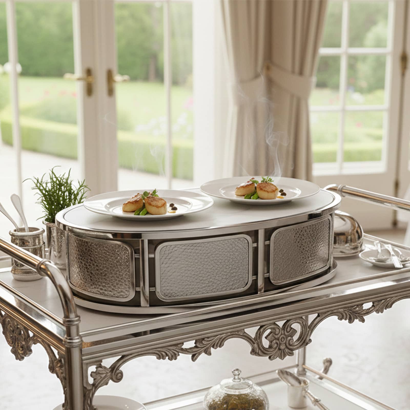 Le Réchaud Oval Martelé associe technicité et raffinement pour sublimer le service à chaud.