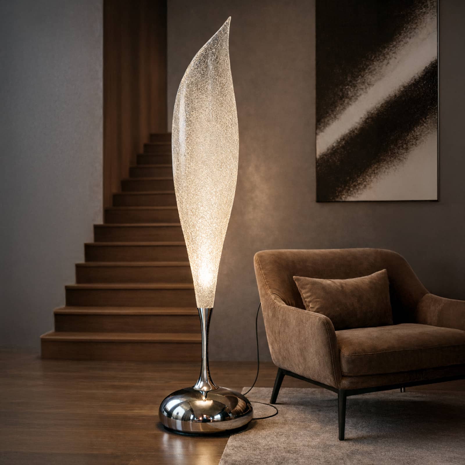 Cette lampe à pied en verre et métal, d’inspiration végétale, révèle une forme organique élancée qui semble s’élever avec légèreté. Son dessin fluide diffuse une lumière douce et enveloppante, créant une atmosphère apaisante et raffinée.