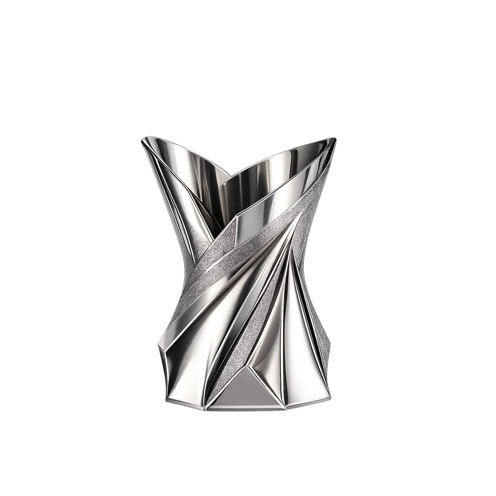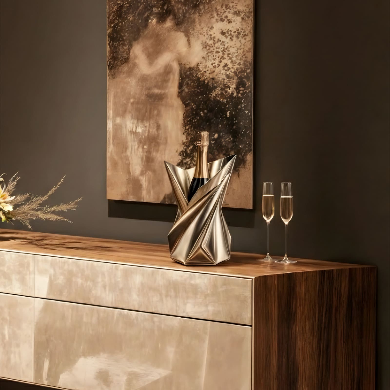 Réalisé en métal argenté ou en laiton, il est équipé d’un container isotherme garantissant le maintien optimal de la fraîcheur du champagne et des vins effervescents. Sa silhouette minimaliste et architecturale privilégie l’équilibre des proportions et la sobriété formelle.