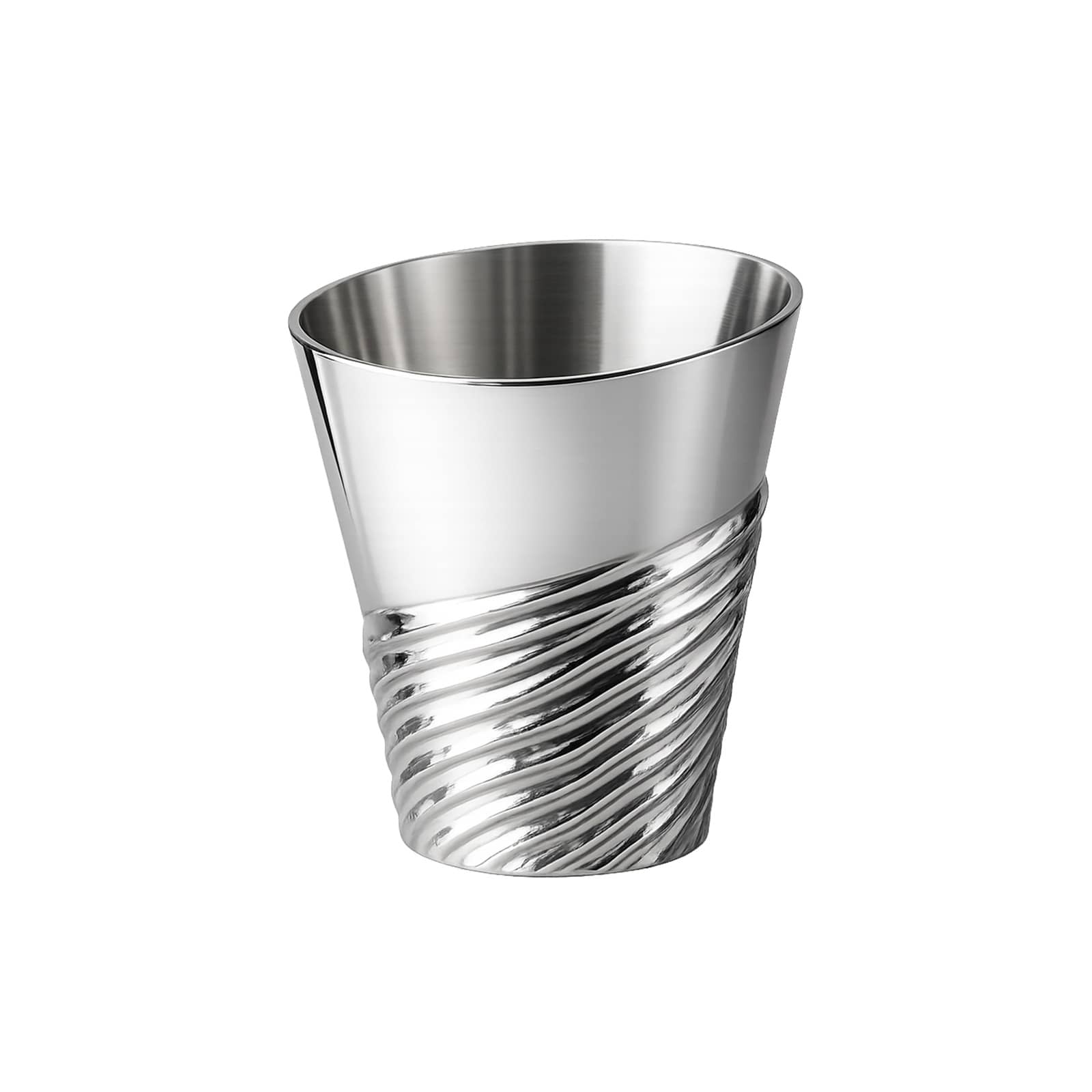 Conçu pour rafraîchir et présenter les bouteilles avec caractère, il est réalisé en métal argenté poli, révélant une brillance élégante et statutaire. Sa conception associe une partie supérieure lisse à une base travaillée en spirale, créant un contraste subtil entre pureté formelle et relief expressif.