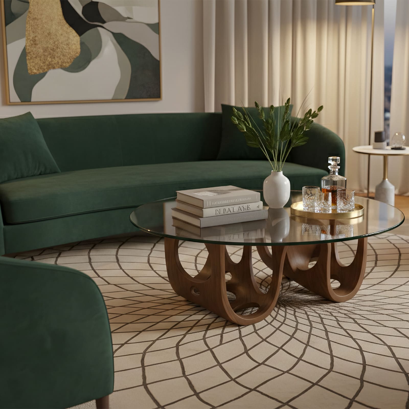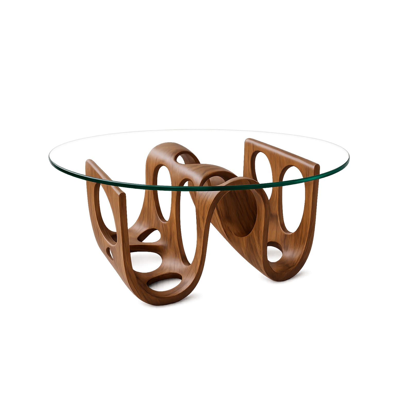 Son plateau en verre trempé, légèrement biseauté, révèle la structure inférieure tout en créant une sensation aérienne. La transparence du verre met en valeur le travail du bois et accentue l’effet de profondeur.